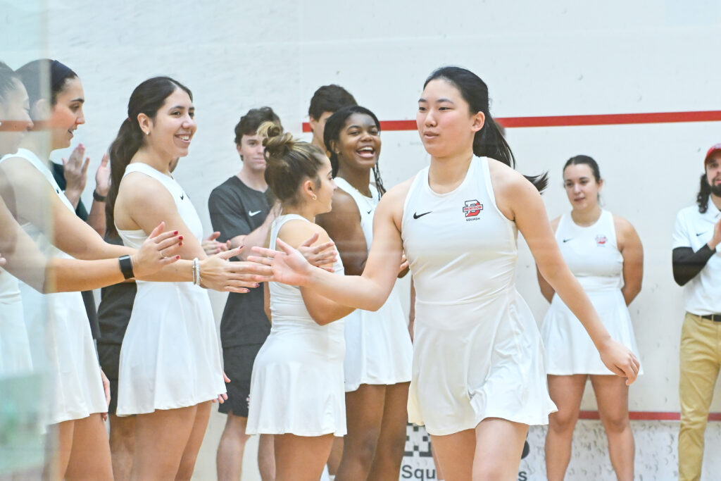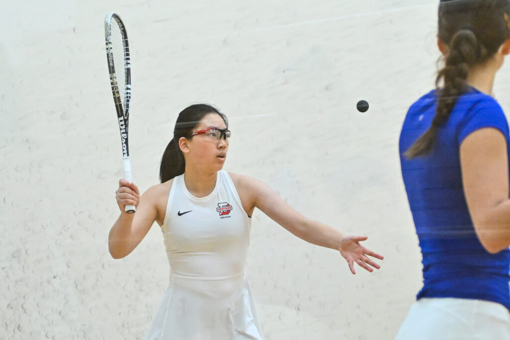 In the longest match of the day, Hamilton’s Eleanor Bunn (#2) outlasted Amelia Keng in a grueling five game run. Bunn fought off match points in a back and forth battle (11-7, 12-14, 11-5, 12-14, 11-6) to secure a signature win for the Continentals in 42 minutes. Hamilton also picked up a win at No. 4, with Diya Dhillon sweeping her opponent 3–0.